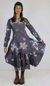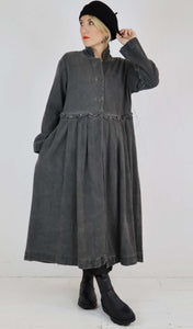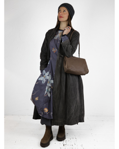 A moody mix of texture and romance, this layered look balances rustic ease with quiet elegance. A Baci frayed overcoat with a distressed waist drapes effortlessly over an Ewa i Walla dull indigo dress scattered with soft, oversized florals.