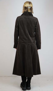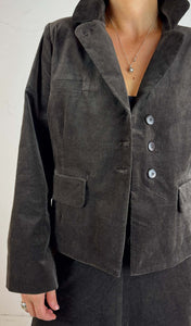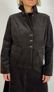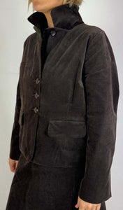Fully lined delicious chocolate brown velvet jacket with smart details, such as lapel collar, three button fastening and traditional pockets.