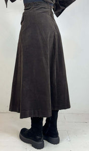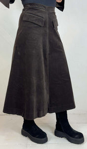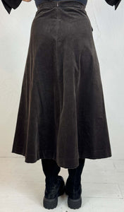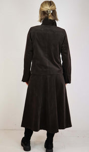 A sophisticated long A-line skirt designed in luxurious chocolate brown cotton velvet with pocket detail. Featuring a fitted elasticated waistband with a concealed back zip fastening and raw edge hemline, finishing below the knee. Fully lined.