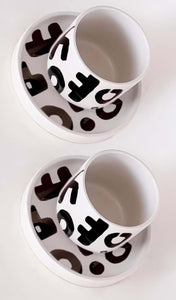 The espresso cup is a mini version of the large coffee cup. The saucer has a flat surface and no cup indentation, making it suitable for holding a small snack.